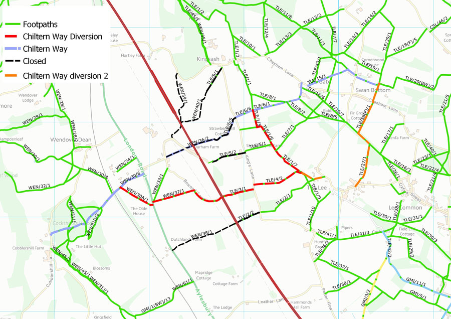 A signed diversion will be provided. This leaves the current route just after crossing the Chiltern Line, taking WEN/30A/1 to cross the A413, then WEN/37/1 . On reaching Bowood Lane, stay on the footpath (on top of the bank). This path may be diverted around the Bowood Lane bridge works for some time, but crosses the construction site at a manned crossing point. On leaving the wood onto Kings Lane, turn left, then right (after 20 yards) onto TLE/4/2. Just before reaching The Lee, turn left onto the Chiltern Link (TLE/1/7,6,5) back to the original Chiltern Way route (TLE/6/1).