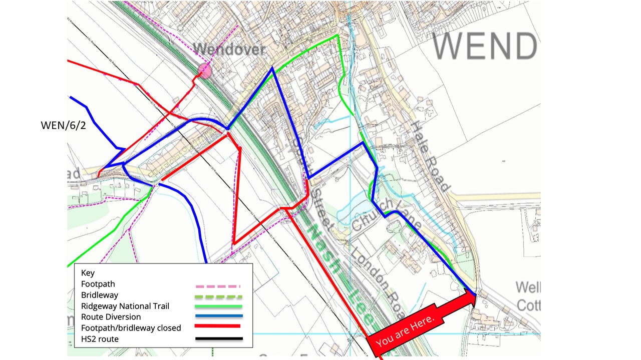 Bacombe Lane is now closed at the bridge over the A413 and Chiltern Line. Access to the western section of the lane is via a new link road, connecting to the (diverted) Ellesborough Road. Other paths near the HS2 works are also closed, as shown in red on the map above.
